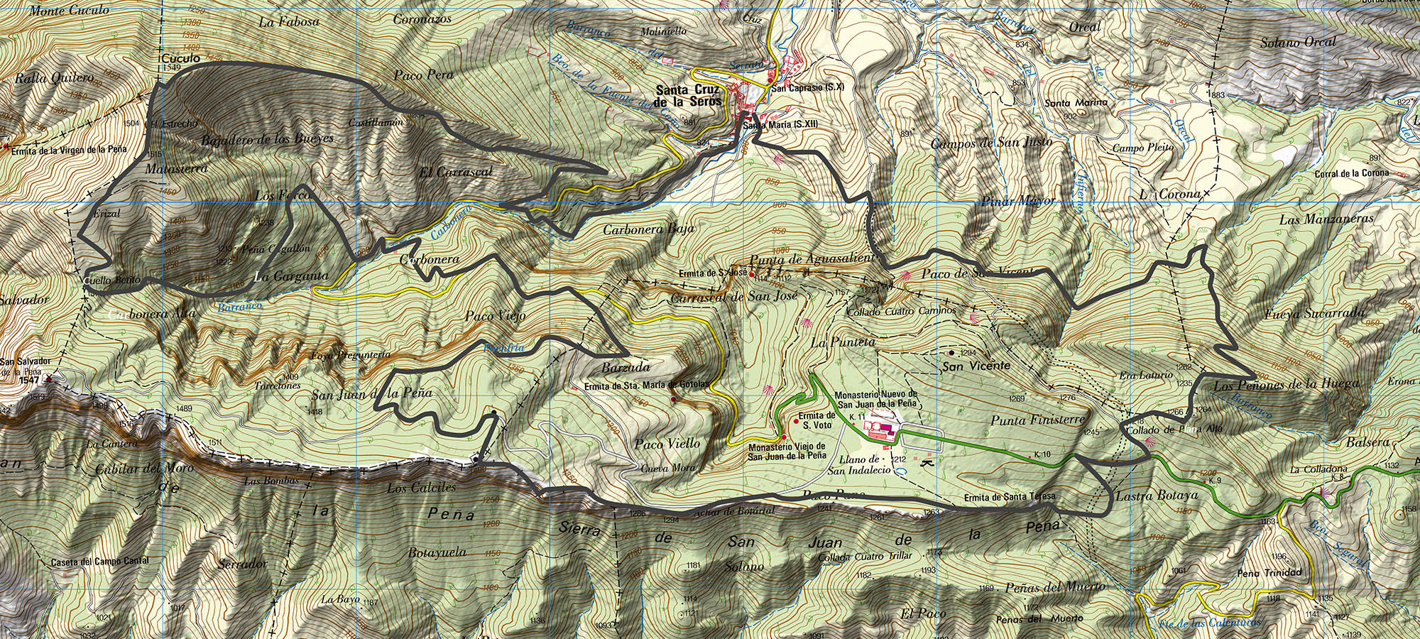 El recorrido rompepiernas es uno de los más largos y espectaculares que podremos realizar en esta zona. Transitaremos por algunos de los senderos más apartados (Paco de San Juan, Camino de las fuentes, senda de Gavin o la senda de Concejo) y como su propio nombre indica, deberemos guardar fuerzas para la última subida a Cuculo por la dura senda de las gradas y luego afrontar el largo descenso por la Ralla hasta Santa Cruz de la Seros. Itinerario recomendado para corredores, ya que su gran distancia y desnivel nos llevaran unas cuantas horas para realizarlo.